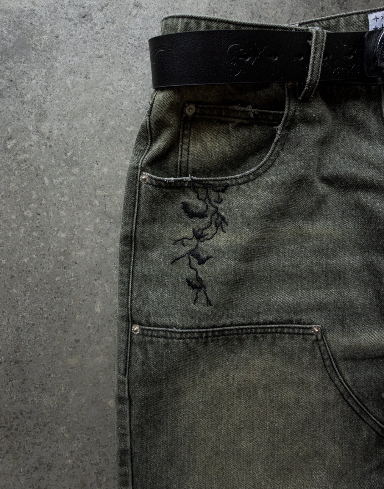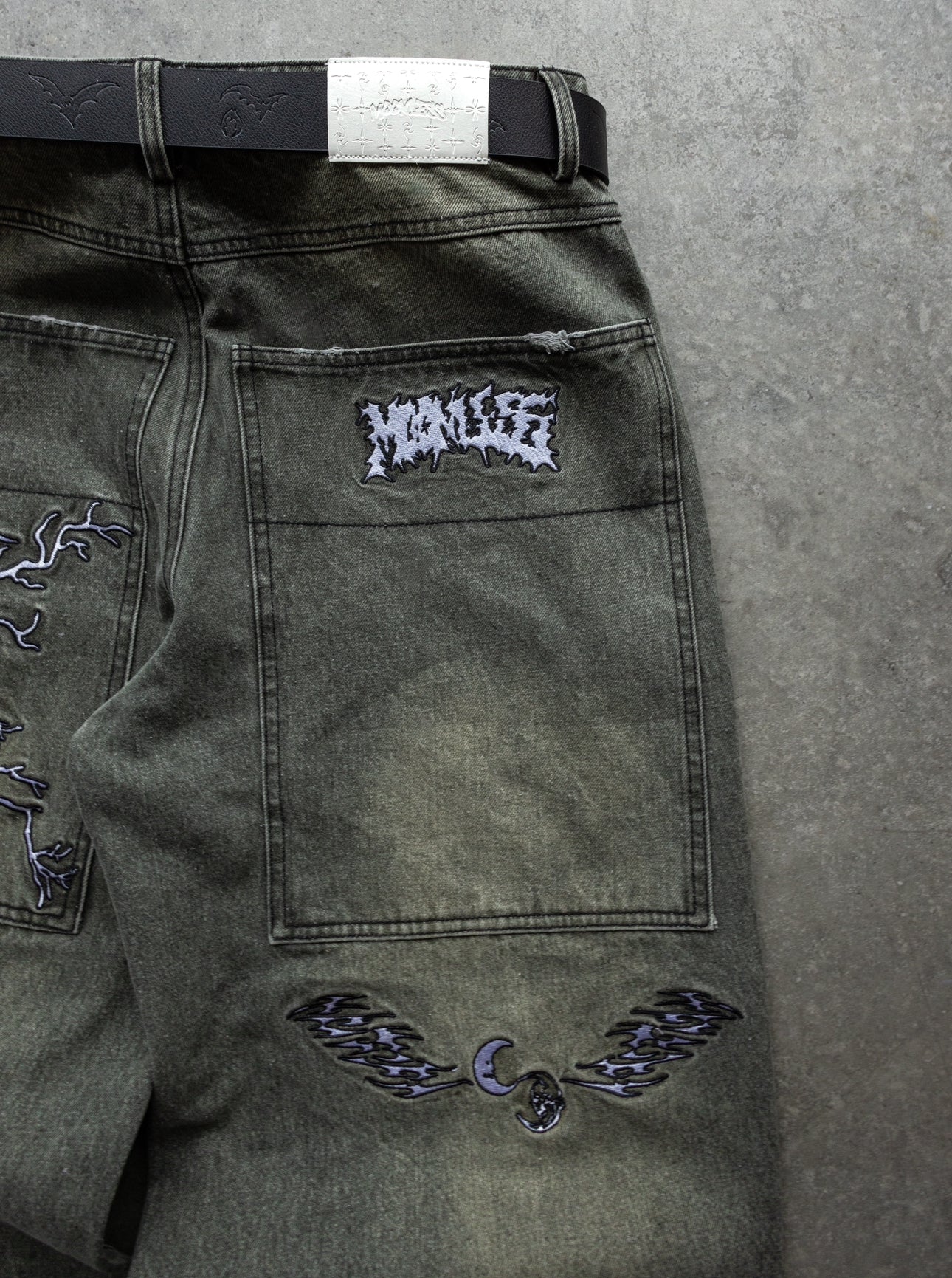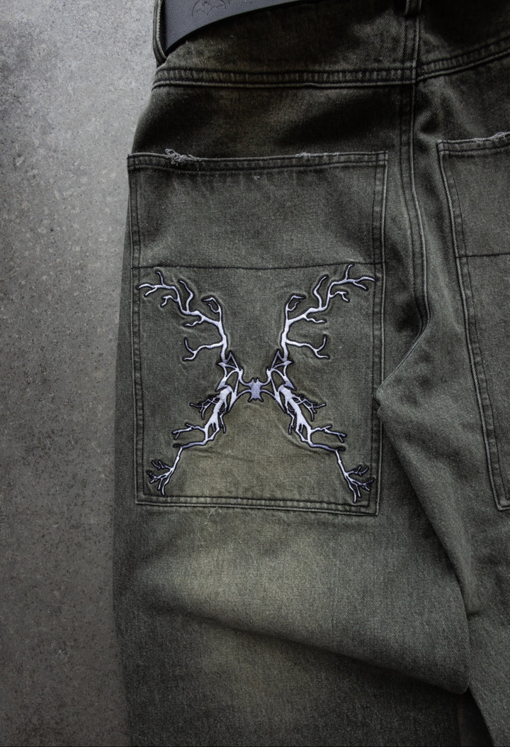 -Green Washed denim with Black sticthes and embroidery