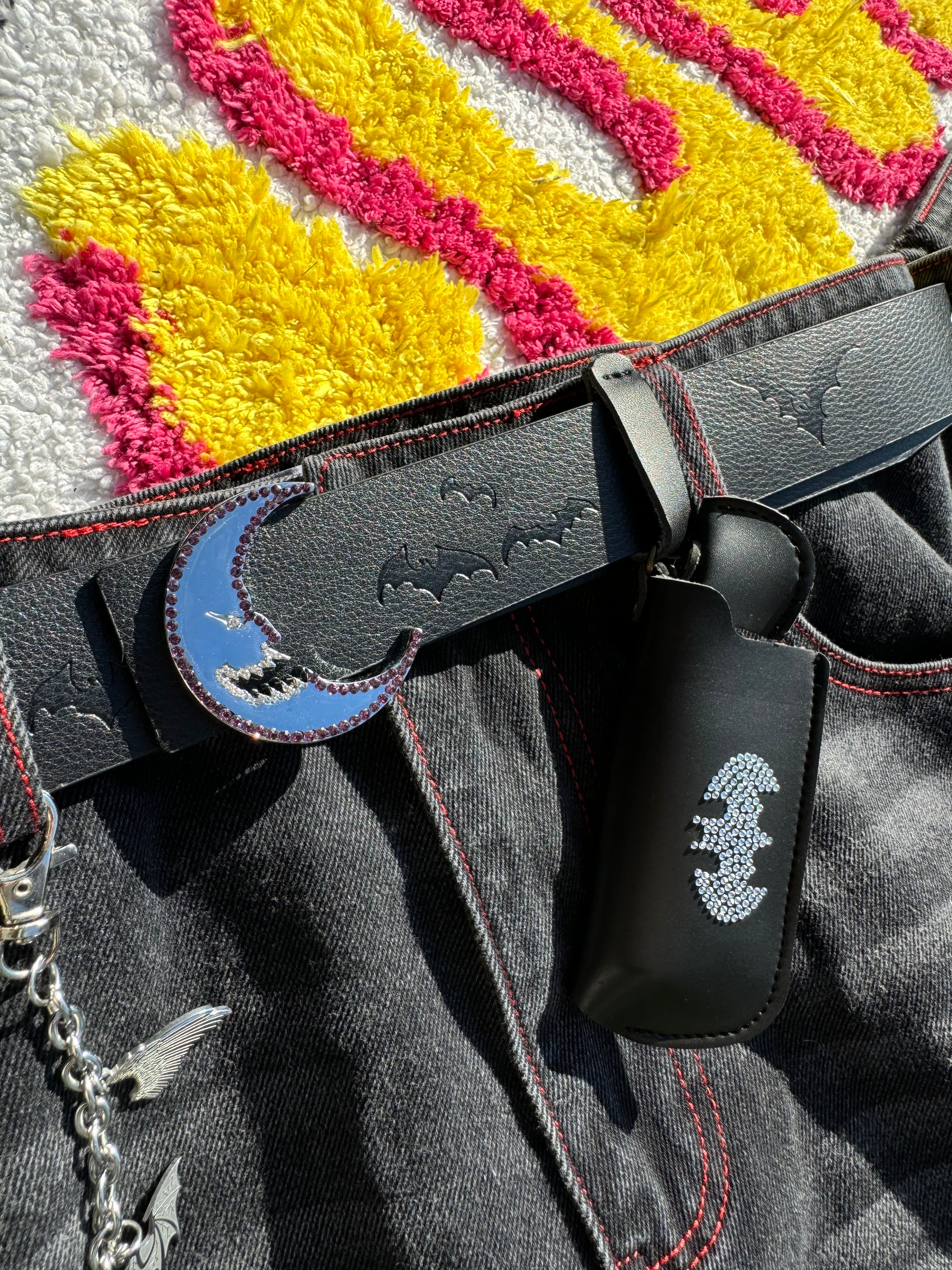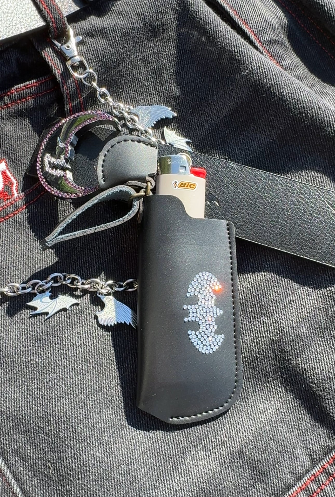 Our belts feature a lighter case, with a batman rhinestone logo! This lighter case is removable. It's also fragile, so please be careful with it